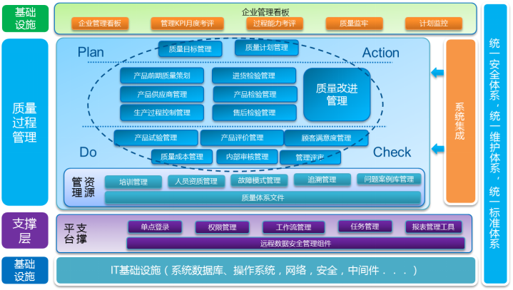 實現(xiàn)質(zhì)量業(yè)務(wù)流程的有效運行: 通過基于流程的、電子化及網(wǎng)絡(luò)化的工作平臺,實現(xiàn)質(zhì)量管理工作的動態(tài)協(xié)同,提高質(zhì)量工作的規(guī)范性和工作效率,保證質(zhì)量管理體系的充分性、適宜性和持續(xù)有效性;實現(xiàn)質(zhì)量信息的有效整合: 實現(xiàn)信息化系統(tǒng)之間的無縫集成,改變質(zhì)量信息被割裂的現(xiàn)狀,消除信息孤島,保證質(zhì)量信息的完整性、關(guān)聯(lián)性和系統(tǒng)性,為質(zhì)量信息的有效應(yīng)用提供堅實的保障;實現(xiàn)質(zhì)量信息的高效應(yīng)用: 借助信息化的優(yōu)勢,實現(xiàn)對質(zhì)量數(shù)據(jù)的全面采集、快速查詢、多維對分析、準確追溯及靈活打包,充分挖掘數(shù)據(jù)價值,實現(xiàn)質(zhì)量數(shù)據(jù)應(yīng)用,保證質(zhì)量管理體系的持續(xù)有效性;實現(xiàn)產(chǎn)品全壽命周期的質(zhì)量控制: 利用計算機技術(shù),協(xié)助設(shè)計質(zhì)量、供方質(zhì)量、生產(chǎn)質(zhì)量及售后質(zhì)量管理,實現(xiàn)質(zhì)量信息的貫通和匯總,過程及質(zhì)量管理體系的持續(xù)改進提供堅實的數(shù)據(jù)保障;實現(xiàn)實時的質(zhì)量協(xié)同監(jiān)控和質(zhì)量決策: 通過質(zhì)量信息在企業(yè)各管理層之間的縱向貫通、傳遞和反饋,為企業(yè)高層領(lǐng)導(dǎo)提供質(zhì)量協(xié)同、監(jiān)控及決策手段,對影響質(zhì)量的關(guān)鍵因素的判讀及正確質(zhì)量決策的制定。