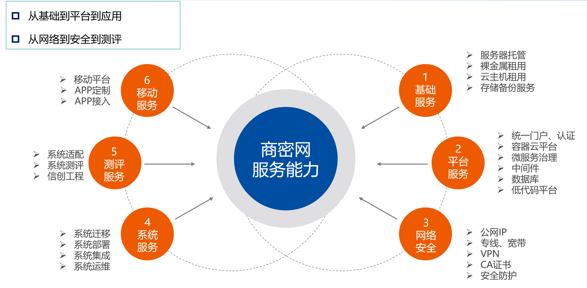 商密網(wǎng)云數(shù)據(jù)中心建設(shè)及服務(wù)理念,貼合集團(tuán)型企業(yè)經(jīng)營(yíng)管理、科研生產(chǎn)特點(diǎn),實(shí)現(xiàn)全新信息技術(shù)與管控模式變革的深度融合,創(chuàng)新服務(wù)理念、優(yōu)化資源配置、增強(qiáng)安全防控、降低運(yùn)營(yíng)成本,不僅能夠提供基礎(chǔ)、網(wǎng)絡(luò)、安全、云平臺(tái)、中間件、數(shù)據(jù)庫(kù)等基礎(chǔ)服務(wù),隨著生態(tài)體系的不斷完善,也能夠提供軟件服務(wù)。